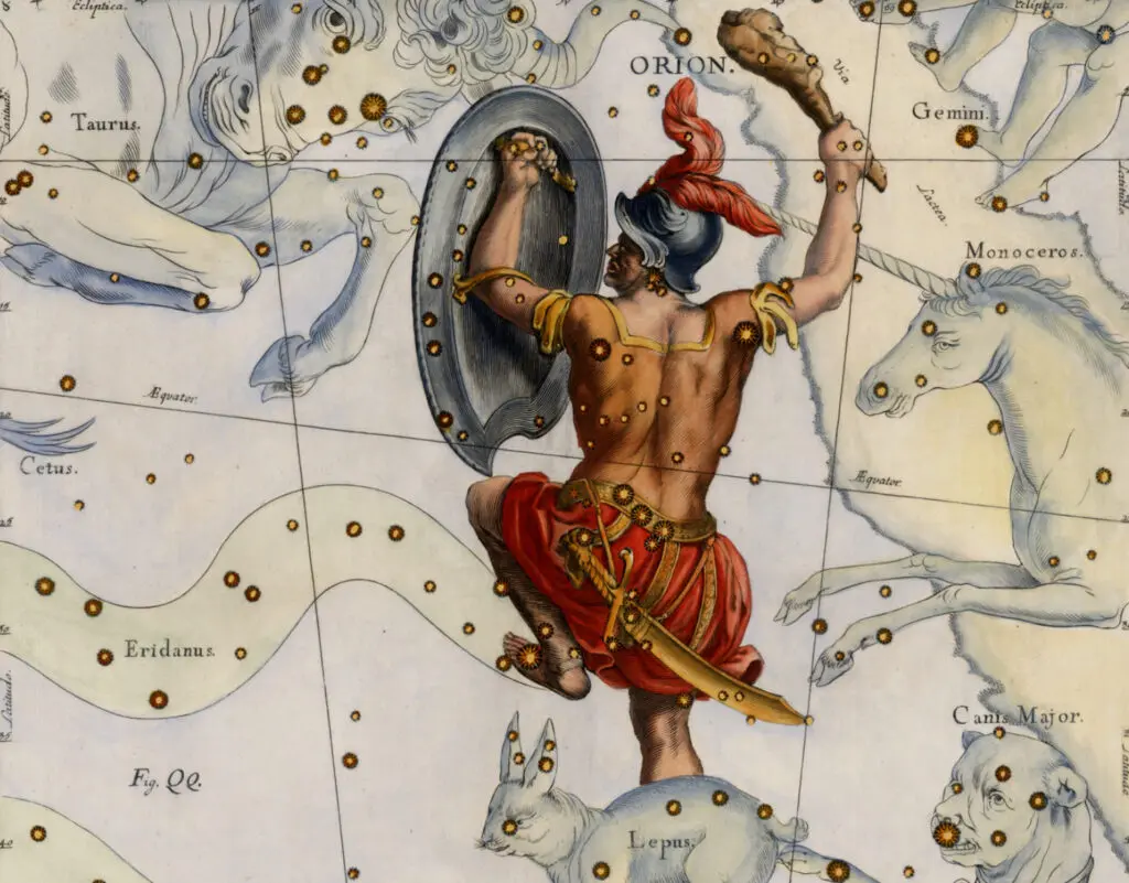 Avand încă mintea agitată de cele întâmplate, nu putea adormi, asa că, uitându-se pe cerul înstelat a început să observe diverse forme și mișcări ale acelor puncte luminoase. Simțindu-se singur, a început să își imagineze diverse forme pe acele puncte. A văzut mistrețul care i-a scăpat azi încă alergand pe cer și razand de el, a văzut un vanator care la fel ca dânsul aleargă după acel mistreț. Aceasta l-a făcut să se simtă mai bine și să se întrebe dacă într-adevăr sunt și alții care îi împărtășesc problemele și oare cum fac ei să se descurce mai bine. Apoi a început să vorbească cu acel mare vânător de pe cer și să îl întrebe cum ar putea și el ca vânător să îmbunătățească metoda sa. Poate o suliță mai bună, poate un traseu mai bun de urmărit pentru a prinde mistrețul ăla fanfaron într-o capcană. Inspirat de această rațiune divină și-a stabilit un nou plan pentru mâine și a adormit.